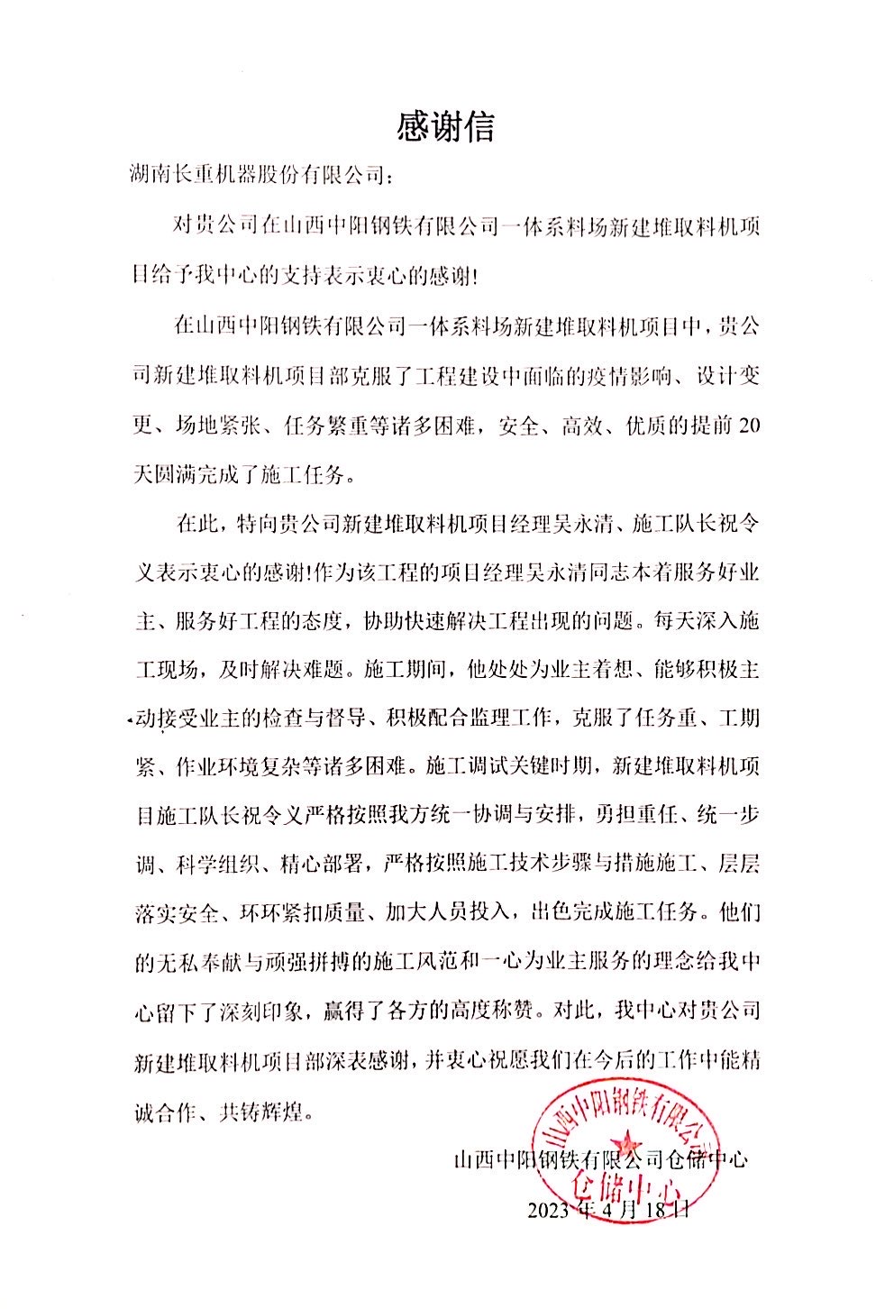 山西中陽鋼鐵有限公司倉儲中心感謝信